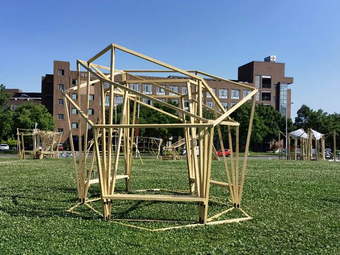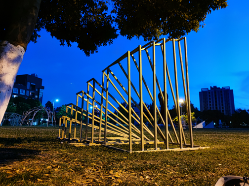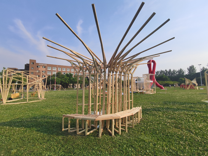 作品建构是由三角形单位旋转而成,富有韵律和动感。内部营造了为人们提供休息场所的空间,提供一种可供人休息的场所,同时也作为一种与“运动驿站“相关联的标识符,是一种兼具实用性和观赏性的建筑。外部造型轮廓呈圆弧形,木条在空间中的排列具有流动感、动态美,极具包容性。