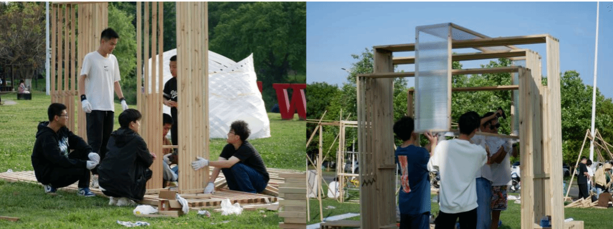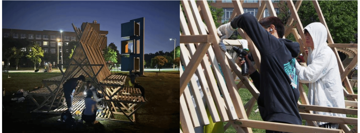 此次建造节于我们而言有苦有甜,累并快乐着。小组由城市设计两个班级的同学共同组成,随着建造的深入,组员之间的了解逐渐增进,关系也愈发紧密。通过对时间的合理安排,我们团结一致,分工明确,高效地完成了最初设定的施工计划,既参与了建造过程,也有自己的休息时间,真正地在劳动节中懂得了劳动的意义。历经六天五晚,我们对劳动、青春有了更深刻的理解。