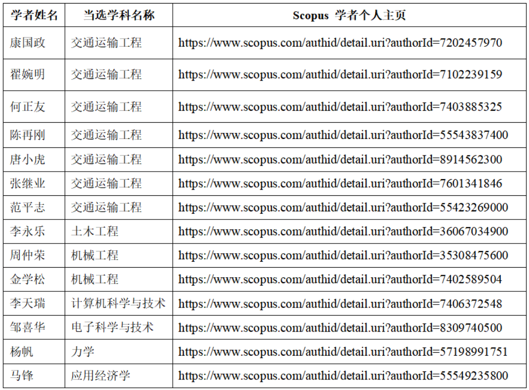 在交通运输工程、土木工程、机械工程、计算机科学与技术、电子科学与技术、力学、应用经济学等学科中共有14位学者入选。