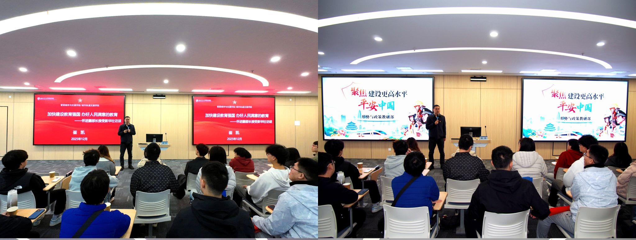 崔凯带领学生党员集体学习教育部部长怀进鹏接受新华社访谈的内容,学习“十四五”时期教育事业的历史性成就、“十五五”时期教育改革发展的新部署新要求和重点任务,深刻把握教育强国建设的重要意义、丰富内涵和系统部署。随后,他讲授《聚焦建设更高水平平安中国》专题思政课,从建设平安中国的重要意义、显著成效、方法路径等方面进行了详细阐述。