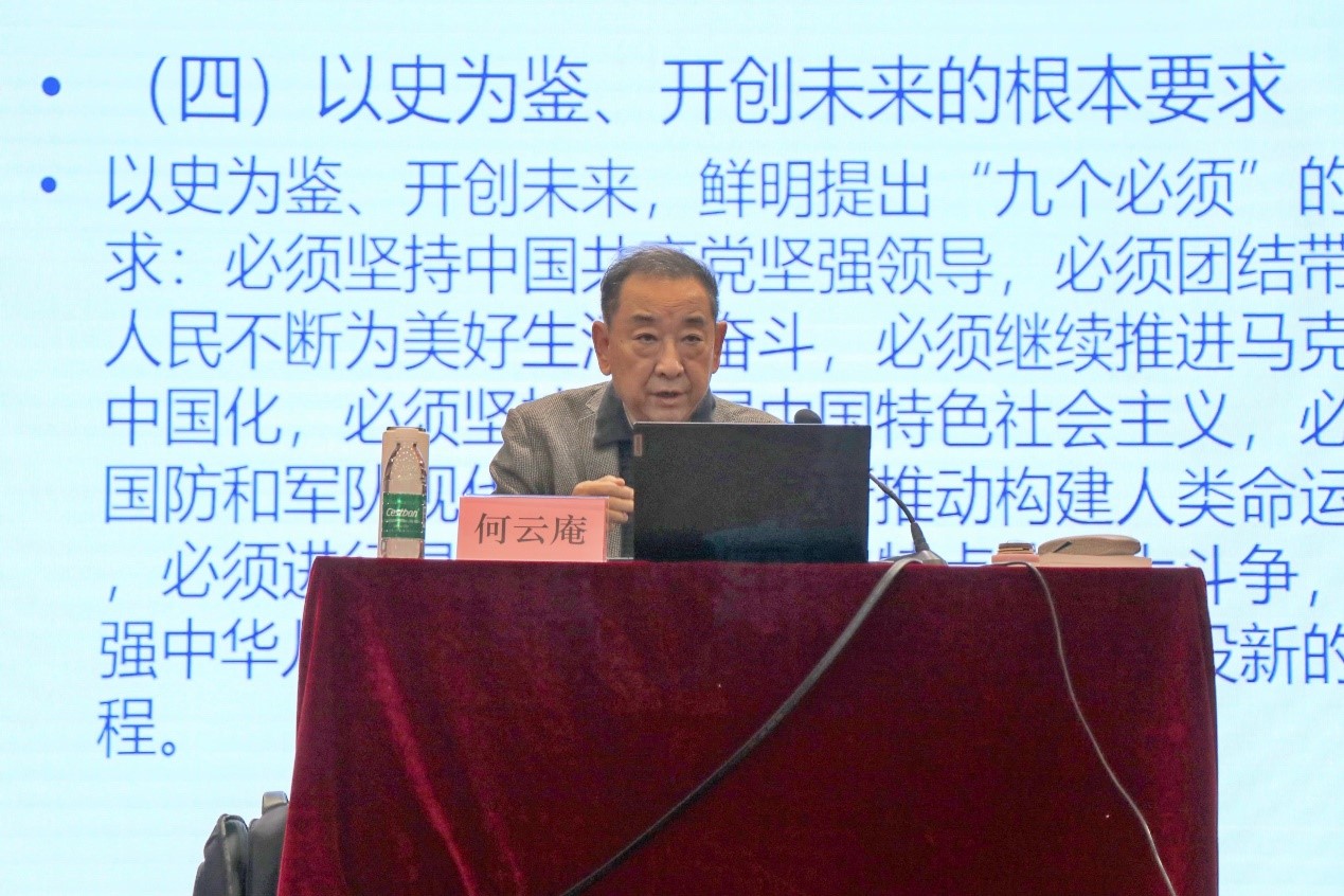 何云庵以“学习伟大建党精神,以史为鉴开创未来--学习习近平总书记‘七一’重要讲话精神体会”为题,从“七一”讲话的重点内容,学习伟大建党精神的初步体会,以史为鉴,开创未来的根本要求三个部分,对习近平总书记“七一”重要讲话进行全面系统阐释。他指出,习近平总书记“七一”重要讲话是引领全党全国人民立足新起点、接力新征程的科学指南和行动纲领,贯穿着辩证唯物主义和历史唯物主义的世界观方法论,提出了一系列新的重大思想、重大观点、重大论断,进一步丰富和发展了习近平新时代中国特色社会主义思想,集中体现了当代中国马克思主义、21世纪马克思主义的最新理论成果。他强调,习近平总书记“七一”重要讲话对广大青年提出了殷切期望,青年是祖国的未来、民族的希望,也是我们党的未来和希望,中华民族伟大复兴终将在一代代青年的接力奋斗中变为现实。
