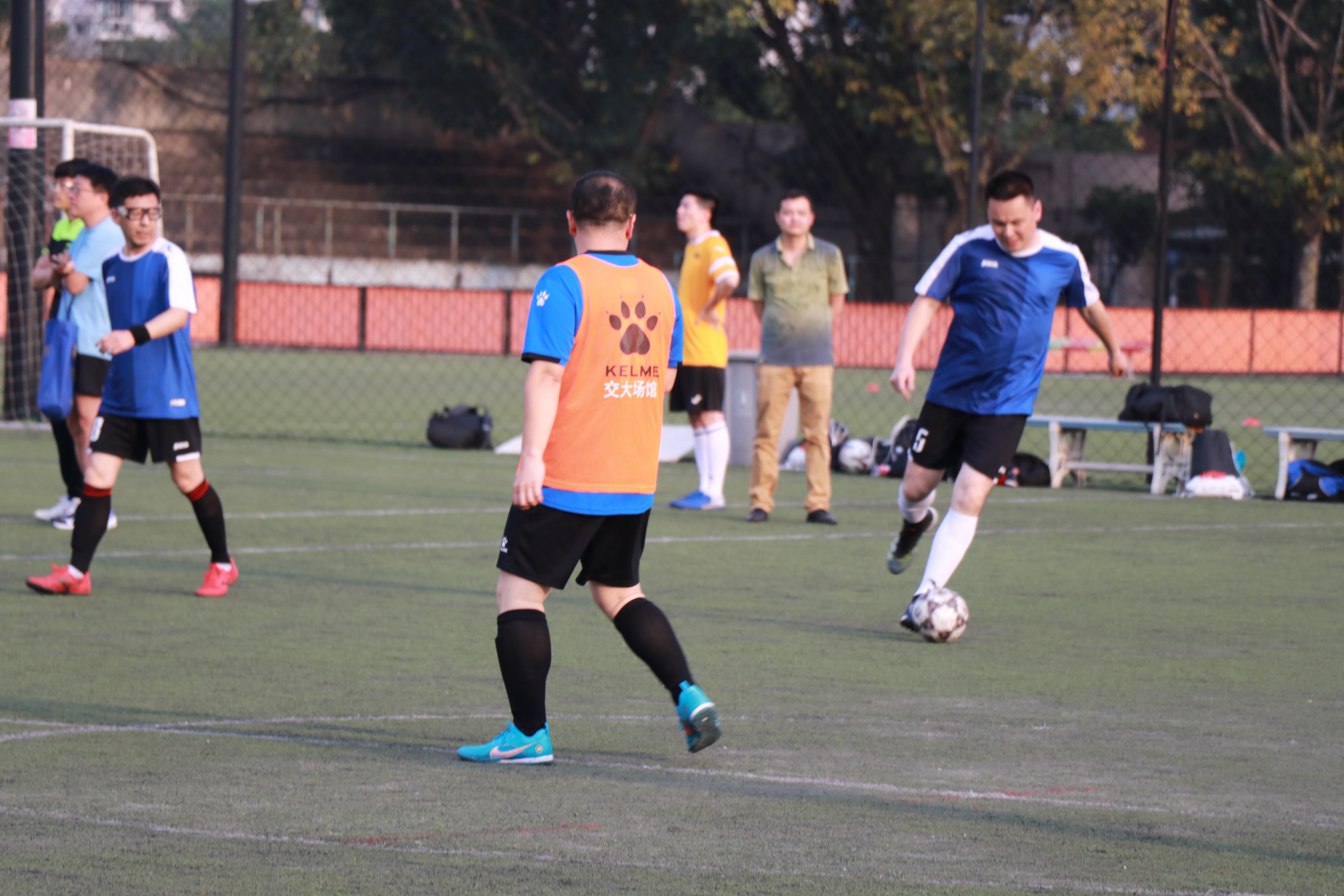 面对强敌,球队按照既定战术安排,通过加强传导配合和跑动穿插,39号邓军、66号赵周鉴、8号俞建海先后进球,取得3-0领先。随后交运学院加强攻势,在难以突入我方禁区的情况下通过远射打入2球。上半场结束我院以3-2领先。