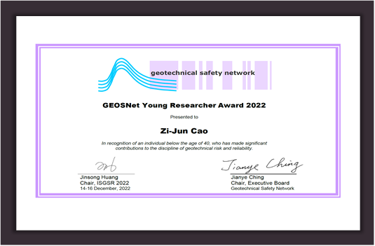 国际岩土工程安全学会GEOSNet 于2006年成立,由岩土工程可靠度与风险领域的国内外知名学者组成,是岩土工程可靠度与风险领域的国际权威学术组织,旨在为促进岩土工程可靠度与风险领域的学术交流和学科发展提供平台。国际岩土工程安全学会青年科学家奖每两年颁发一次,每次颁发给一至三位40岁以下、对岩土工程可靠度与风险研究领域做出重要贡献的国际拔尖青年学者。