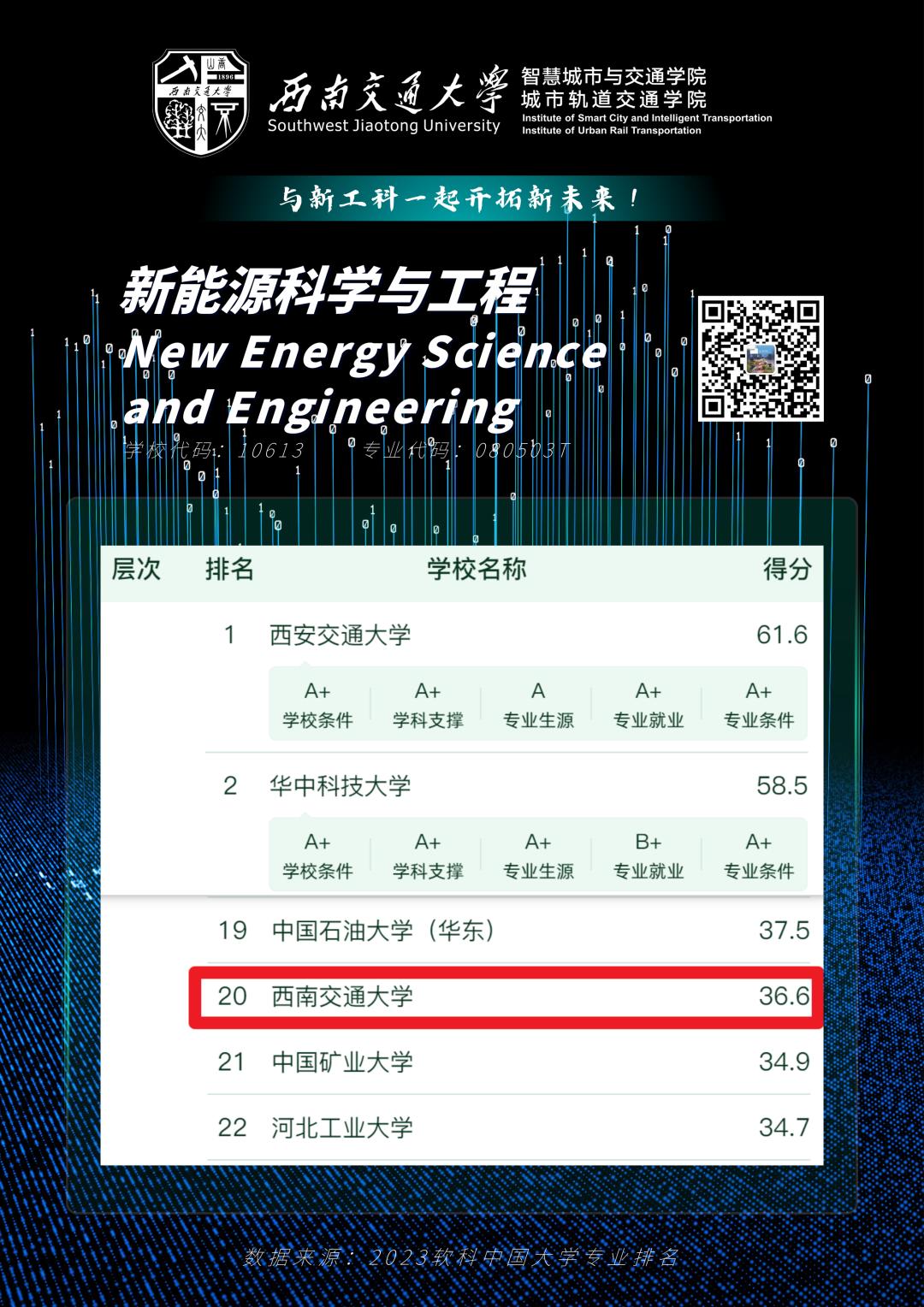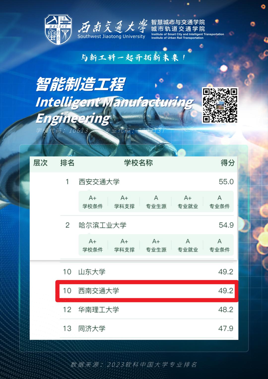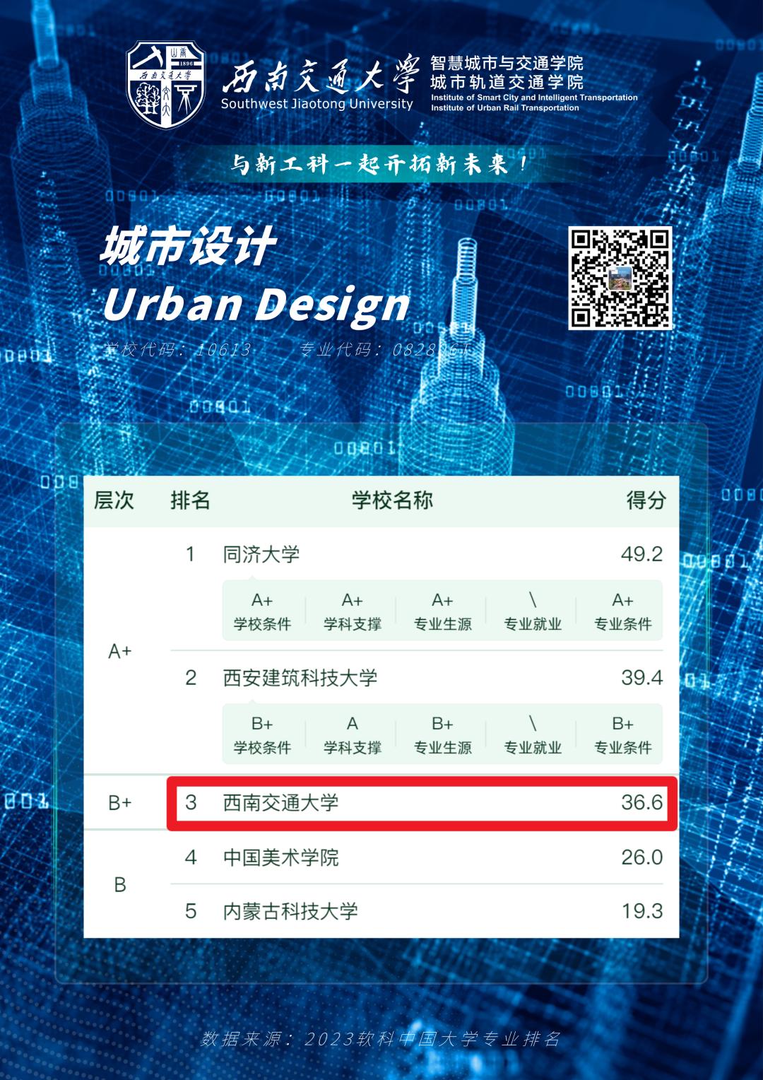 智能建造、智能制造工程位列A层次,排名全国第5、第10。新能源科学与工程、城市设计位列B+层次,排名全国第20、第3。智慧交通位列A+层次、排名全国第1。五个新工科专业全部上榜,彰显了学校和学院在人才培养方面的专业实力。