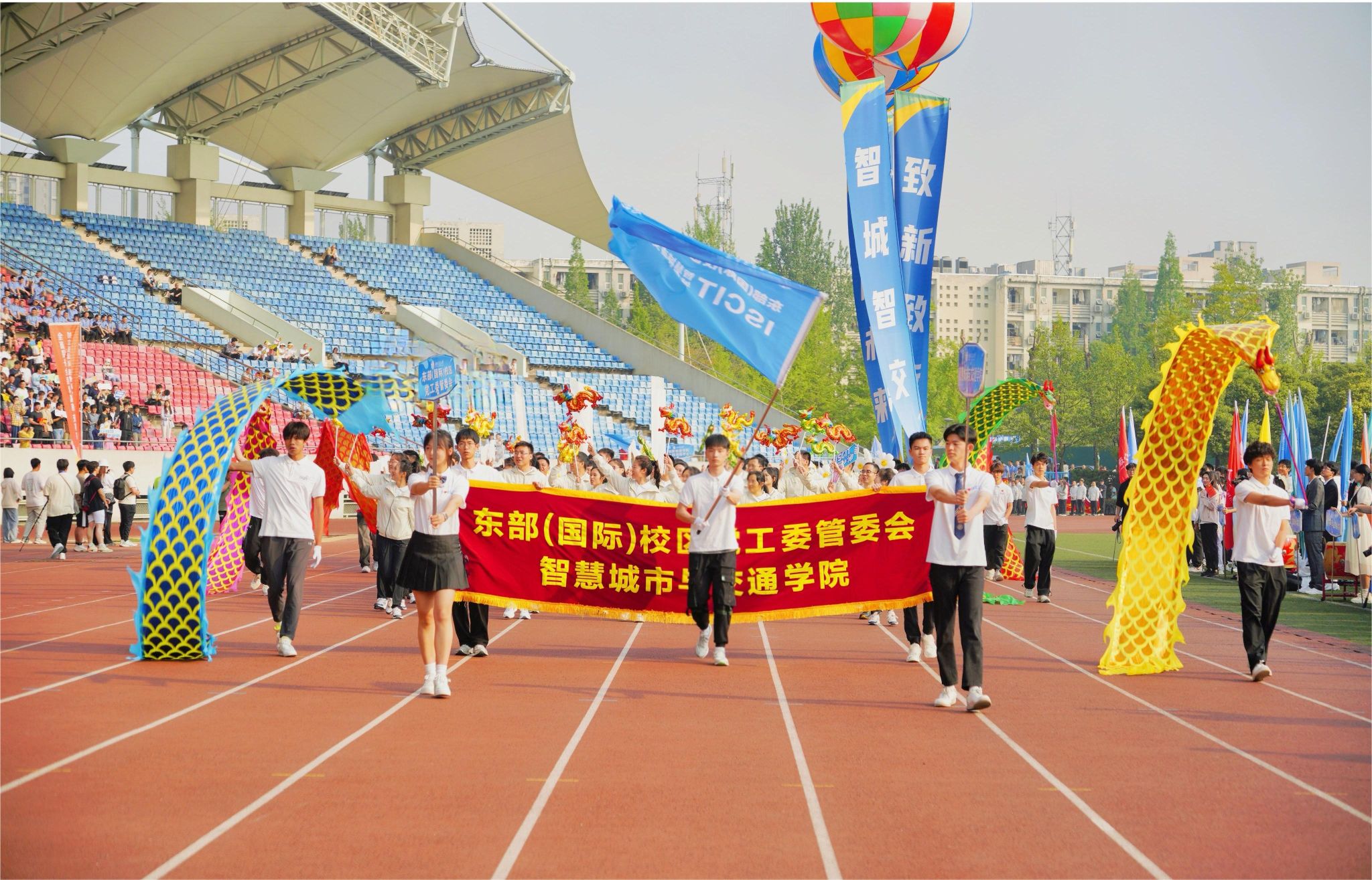 代表队高举东部(国际)校区2022-2024年校园建设展示牌,手持五彩龙、太阳花气球精彩亮相。在方阵两侧,六条缤纷的彩龙翩飞旋舞,多彩气球牵引着印着学院口号的旗帜,随着严整的方队一同行进,俨然是运动场上最瞩目的色彩!