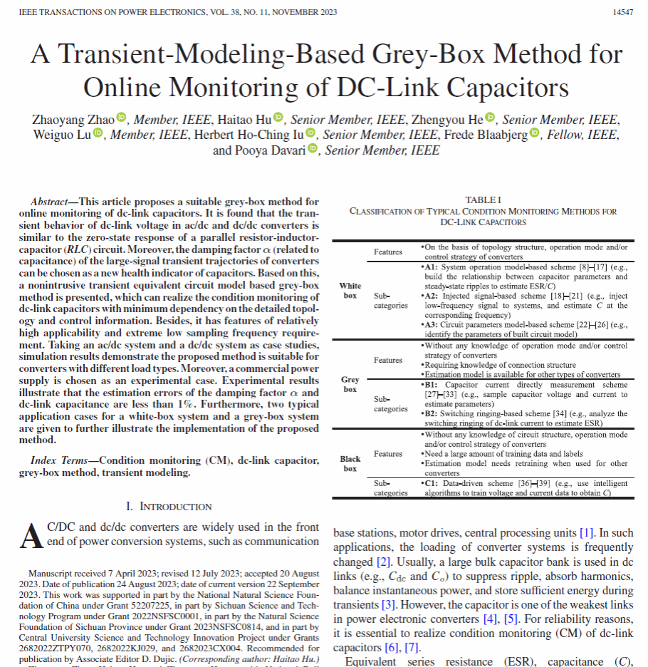 Z. Zhao, H. Hu, Z. He, H. H.-C. Iu, F. Blaabjerg and P. Davari, “A Transient-Modeling-Based Grey-Box Method for Online Monitoring of DC-Link Capacitors,” in IEEE Transactions on Power Electronics, vol. 38, no. 11, pp. 14547-14562, Nov. 2023.