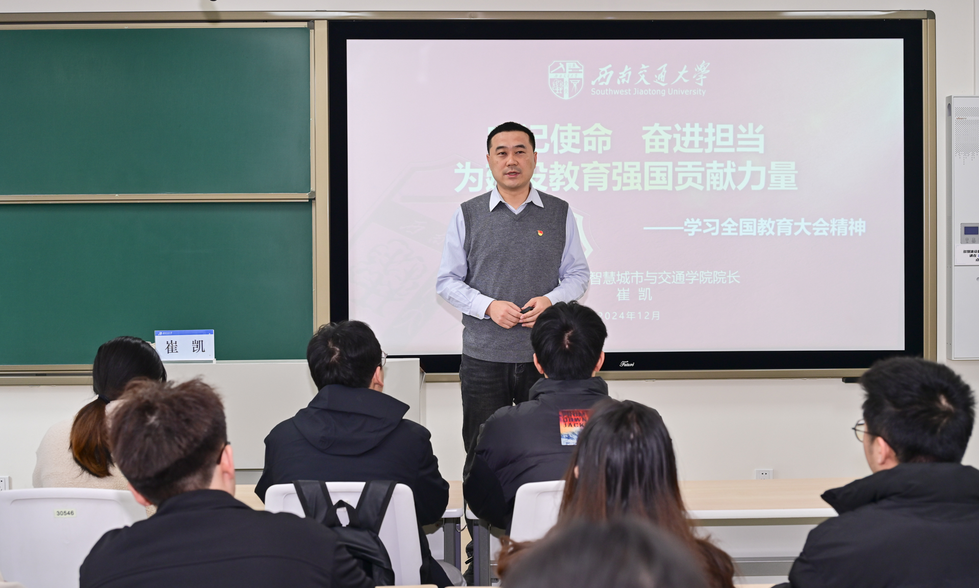 院长崔凯为学院全体学生党员讲授学习全国教育大会精神专题党课。专题党课由学院党委副书记夏夏主持。