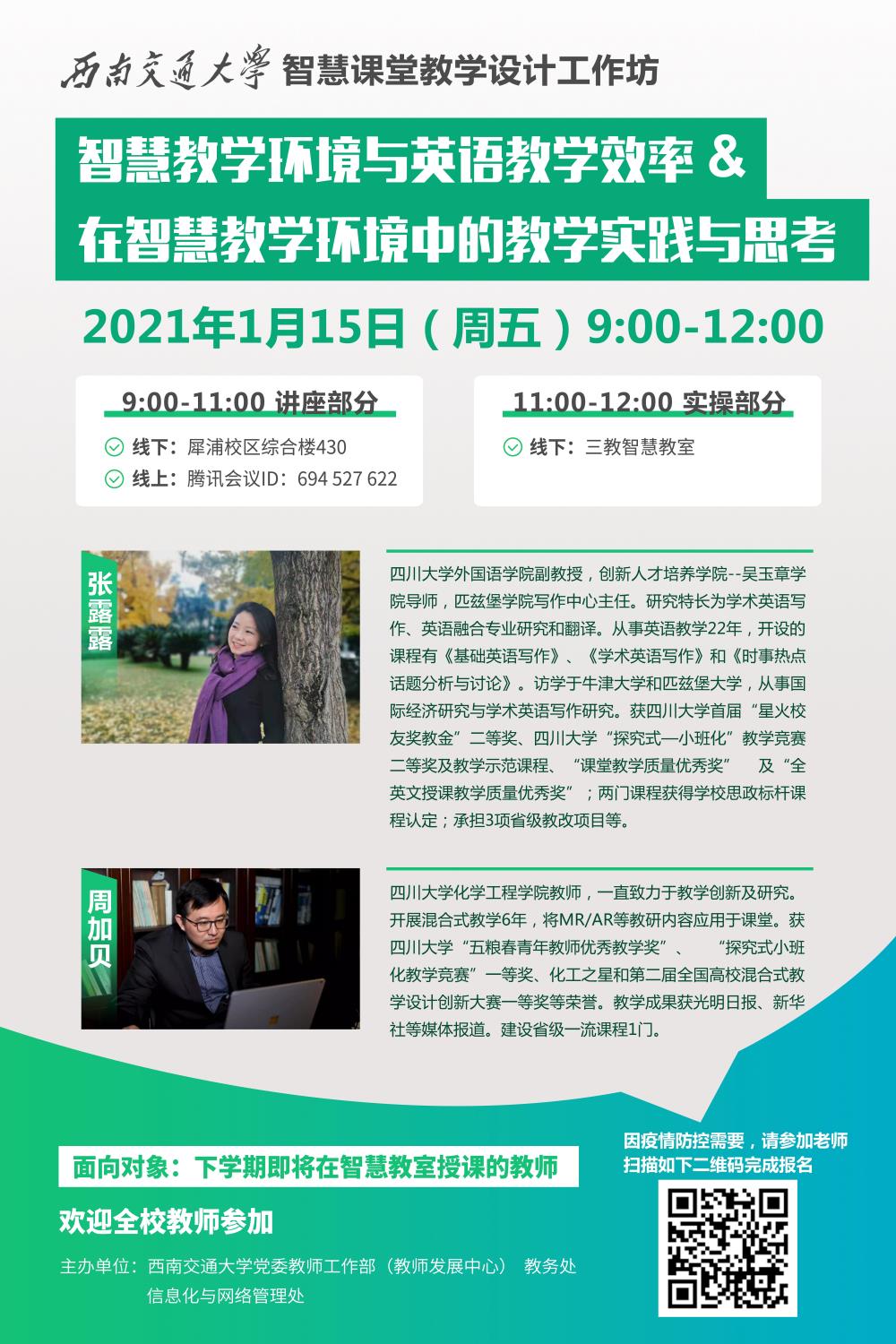 学校智慧教室即将启用,为帮助教师有效利用智慧环境开展教学活动,将邀请四川大学智慧教学专家张露露和周加贝两位老师,结合课程实例,讲授如何进行智慧教学环境中的教学设计。
