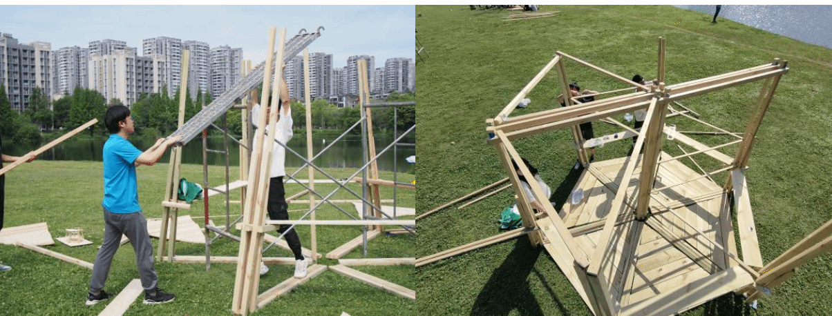 此次建造节于我们而言有苦有甜,累并快乐着。小组由城市设计两个班级的同学共同组成,随着建造的深入,组员之间的了解逐渐增进,关系也愈发紧密。通过对时间的合理安排,我们团结一致,分工明确,高效地完成了最初设定的施工计划,既参与了建造过程,也有自己的休息时间,真正地在劳动节中懂得了劳动的意义。历经六天五晚,我们对劳动、青春有了更深刻的理解。