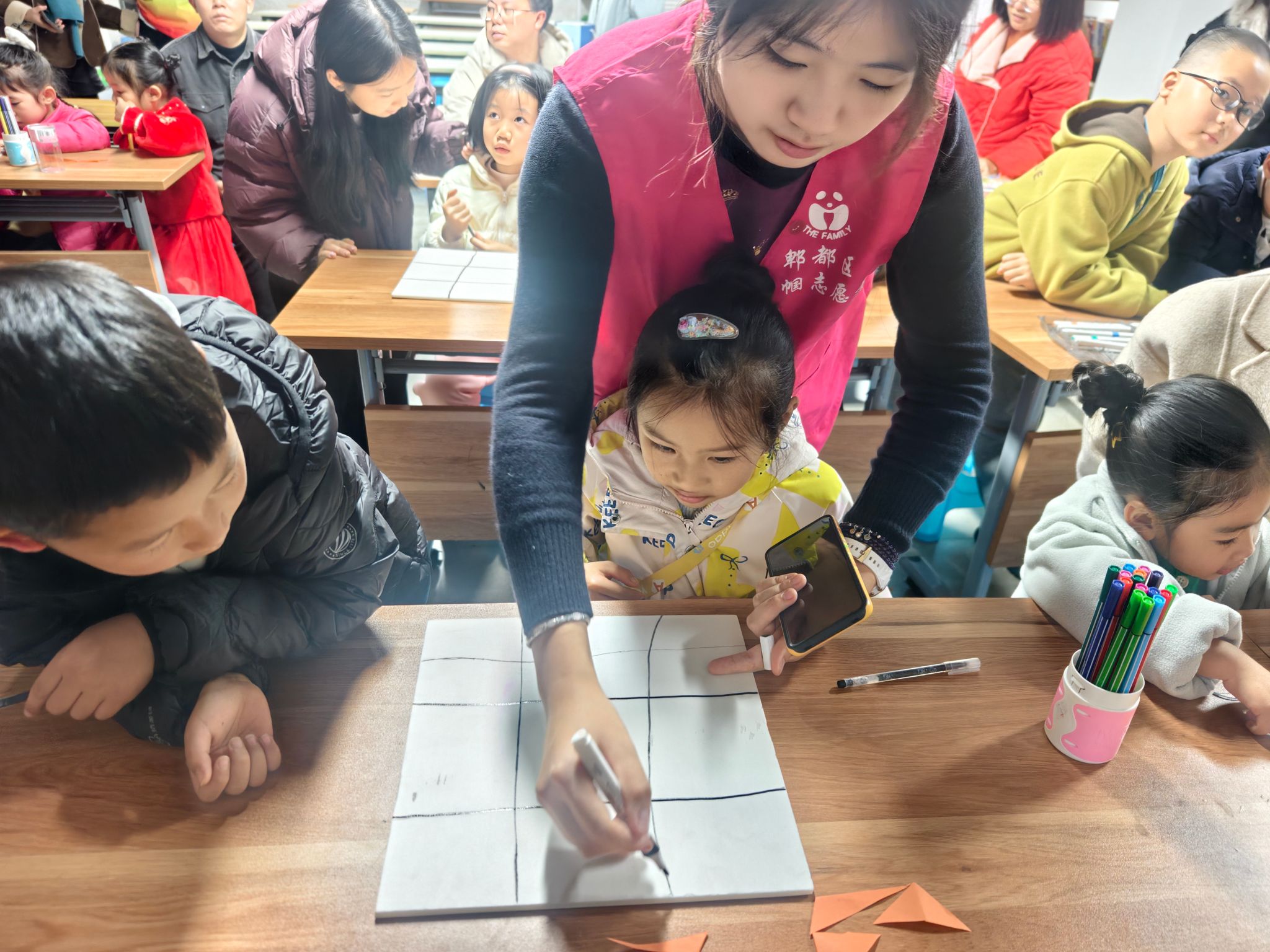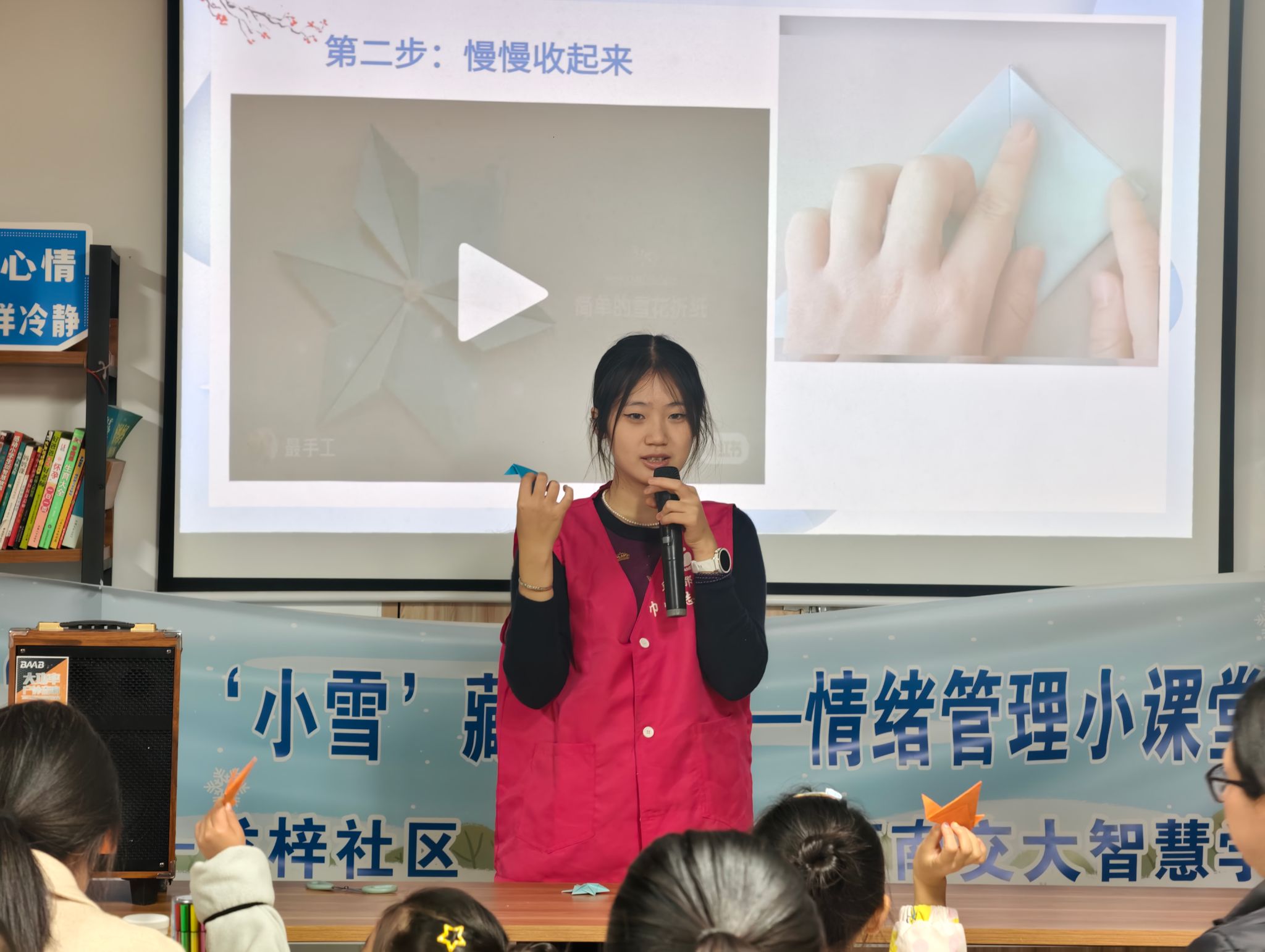 “小小雪花装心声”环节,孩子们在志愿者的耐心指导下,将写有烦恼或秘密的纸片折叠成片片雪花。在有趣的手工制作中,孩子们不仅锻炼了动手能力,更学会了用创造性的方式表达和疏导情绪。