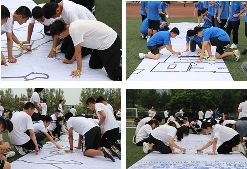 最后一个部分是共绘蓝图。一张宏大的图片被分割为十三等分,由全院的13个班级321名同学共同为它上色。大家以大地为画板,为画笔灌输灵魂,用颜料舞动青春,靠双手创造色彩。一小时后,空白的画布被各色颜料涂满,构成一张活动的主题海报。最后,全体同学在自己绘制的巨画之前合影留念,欢快的歌声响彻场地。