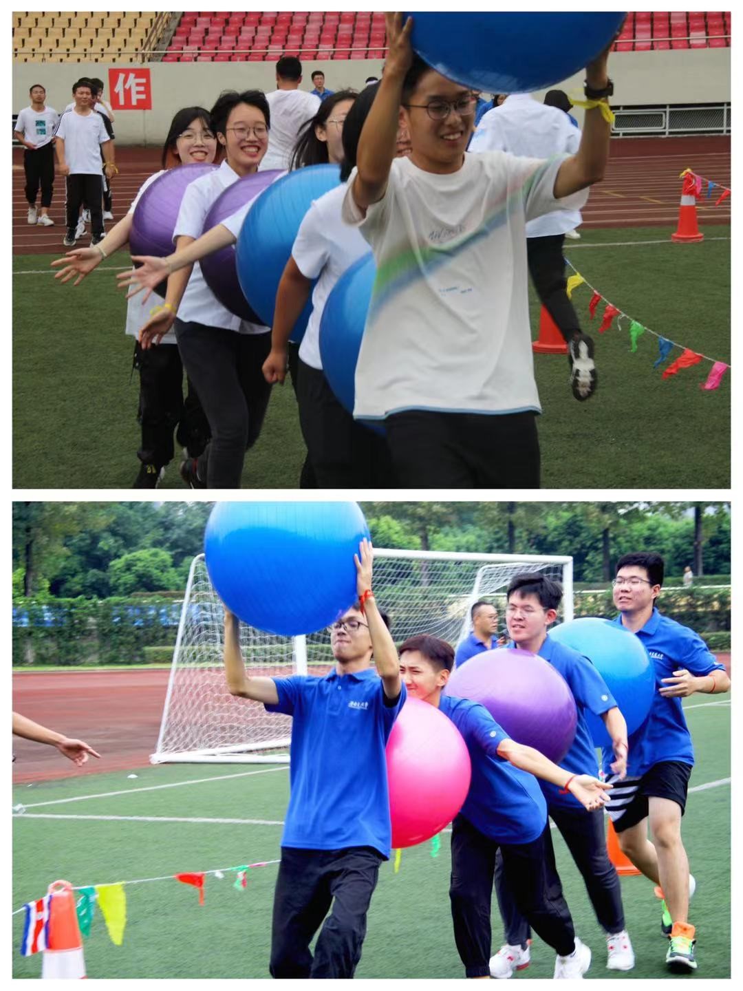 在协力竞走活动中,全体同学以班级为单位、五人一组,以特定规则携带瑜伽球前进。在这一环节里,所有同学都利用自己的体能和智力,拼劲全力创佳绩,来为班级争光,增进了班级的凝聚力,加强了同学间的默契。