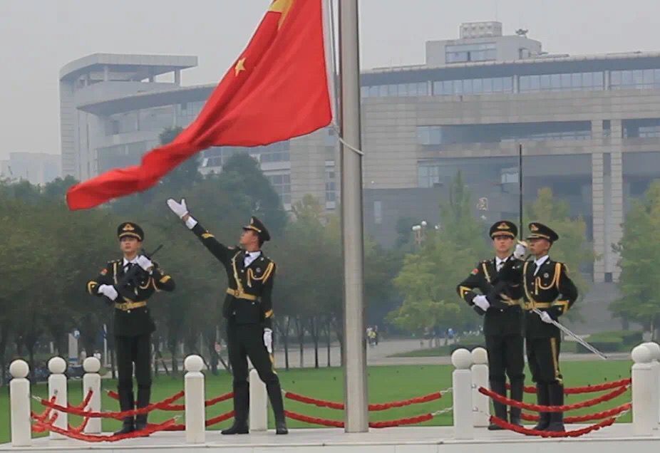 庆祝新中国成立72周年升国旗仪式在国旗台隆重举行。随着国旗护卫队队长响亮的口令,护卫队方阵踏着整齐的正步走来,庄重地将五星红旗护送至国旗台。