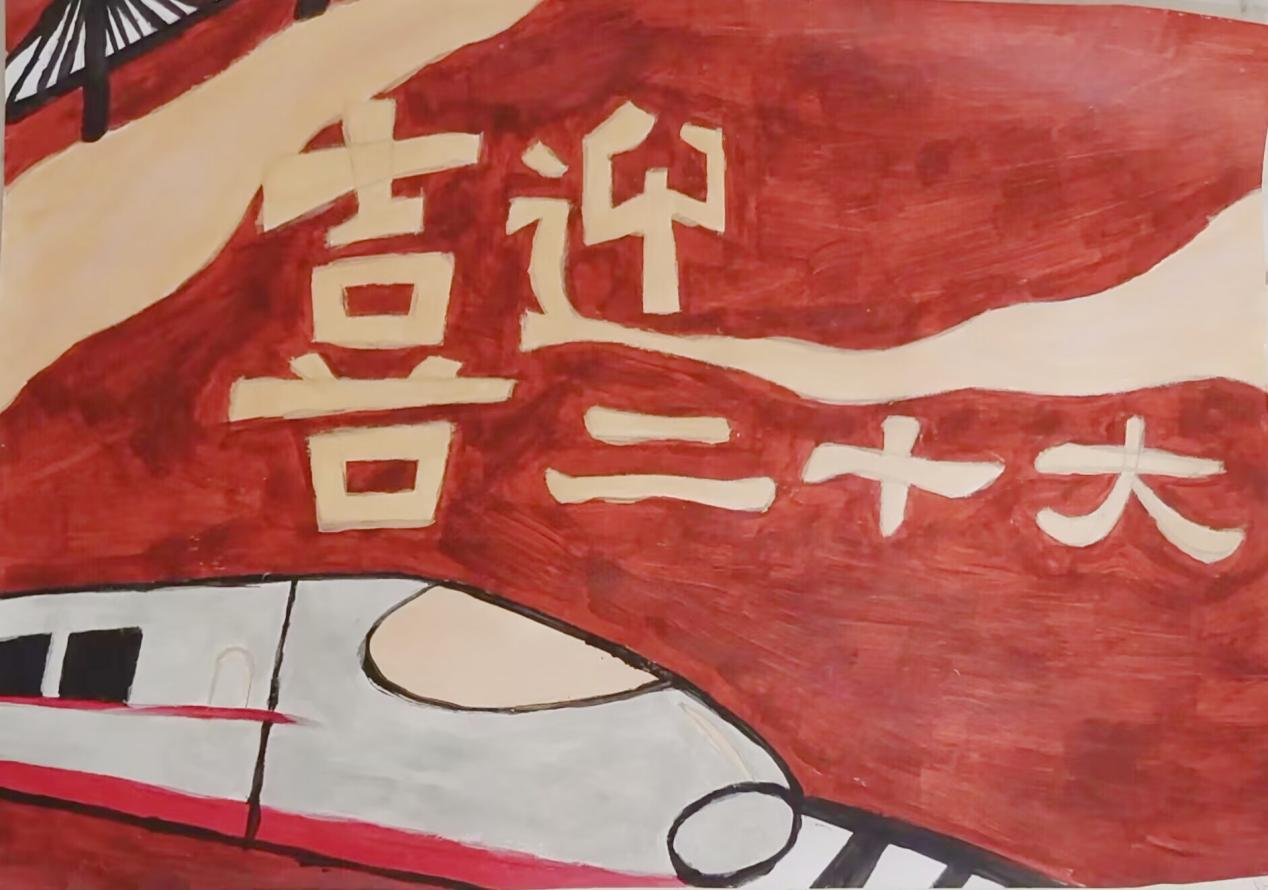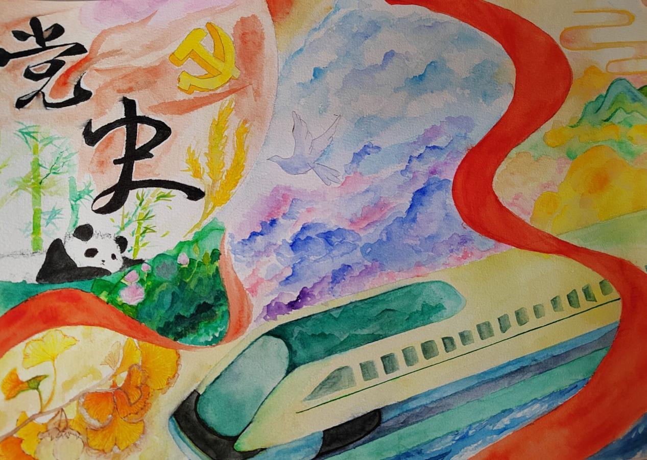 本作品蕴含着“党史”“跨越春夏秋冬的高铁”“飘扬的红色丝带”“熊猫”等元素。图画中银杏和熊猫寓意为“天府之国”,高铁彰显着我校“天地交而万物通”的崇高意境,且与党史元素交相辉映。全图意涵丰富,立意深远。