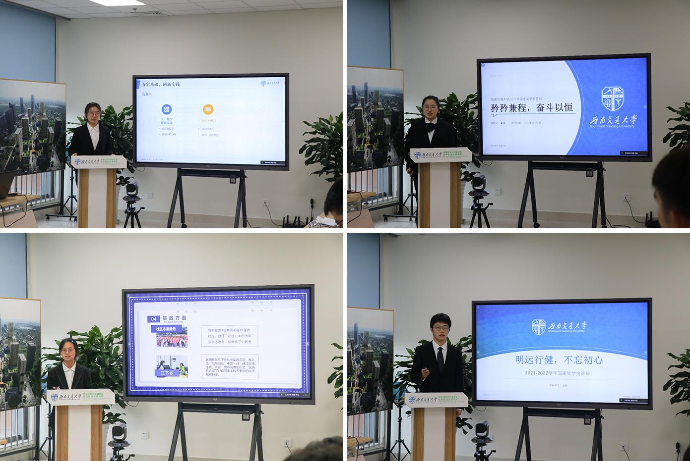 答辩会上,14名国家奖学金候选人依次上台,展示自己在专业学习、科技创新、学生工作、文体活动、社会实践、志愿服务、竞赛获奖等方面取得的成绩。每一位同学都具有高度的理想信念与使命担当,他们关注社会、乐于奉献,充分体现了新时代青年昂扬向上的精神面貌。