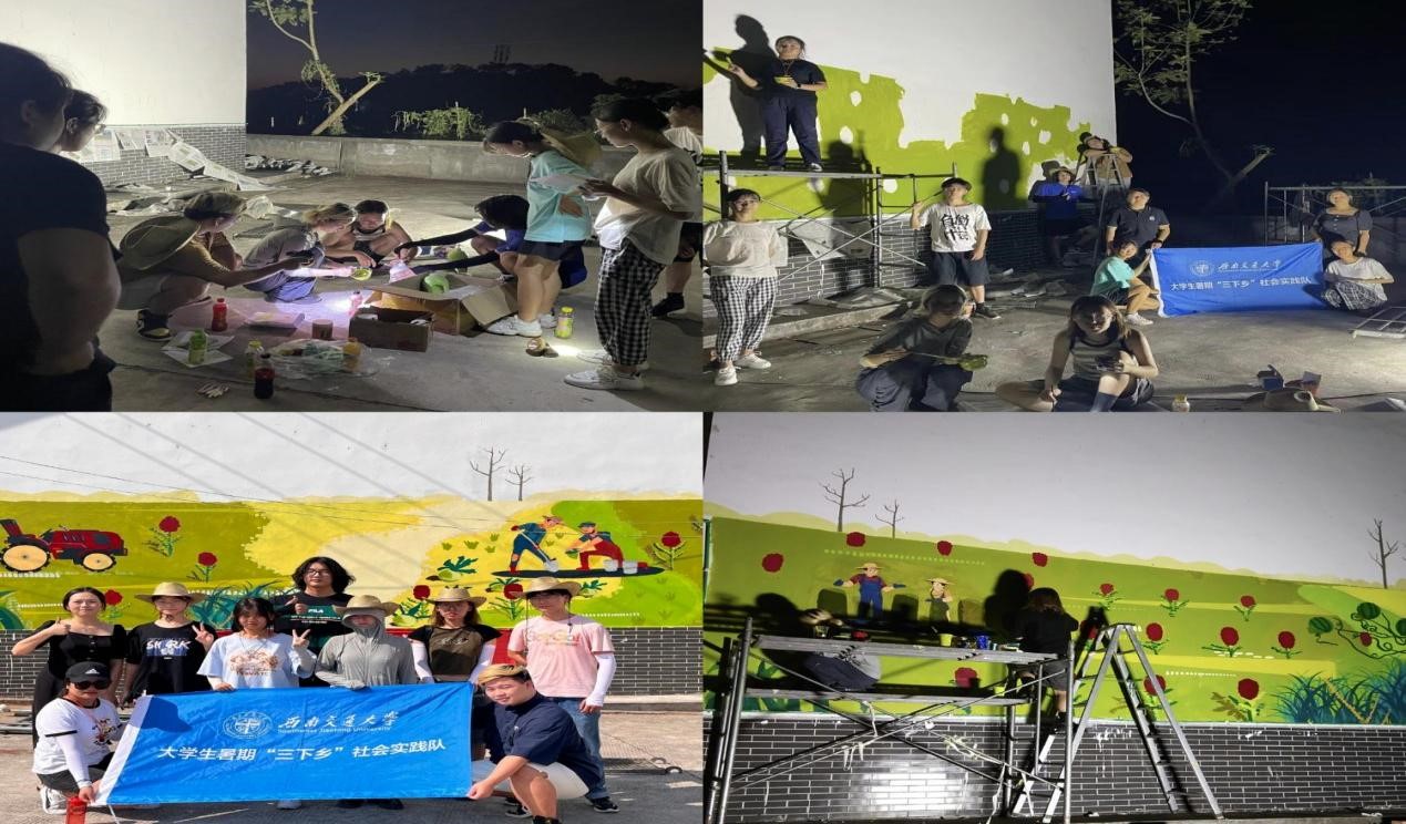 学院和建筑学院赴自贡市沿滩区“共绘乡村”主题实践队来到自贡沿滩九洪乡三河村,开展了“美丽乡村·绘梦青春”主题实践活动。实践队队员规划墙绘规模、克服艰苦条件、早晚开展工作,将做贡献的决心转化为实际行动。实践队队员借助专业所长,助力乡村振兴,美化乡村环境,以绘画之美,发青春之光,最终得到了村民们和沿滩区团委的高度肯定。