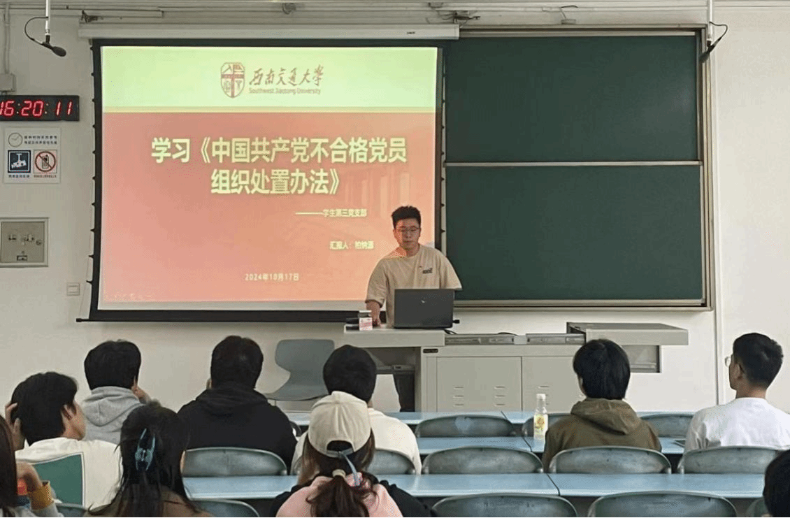 同时,学院学生党支部在犀浦校区开展10月主题党日。罗浩元同志领学习近平总书记在全国教育大会重要讲话和全国教育大会精神,介绍了大会的基本情况,深入学习习近平总书记关于教育强国的科学内涵和基本路径的重要讲话内容。