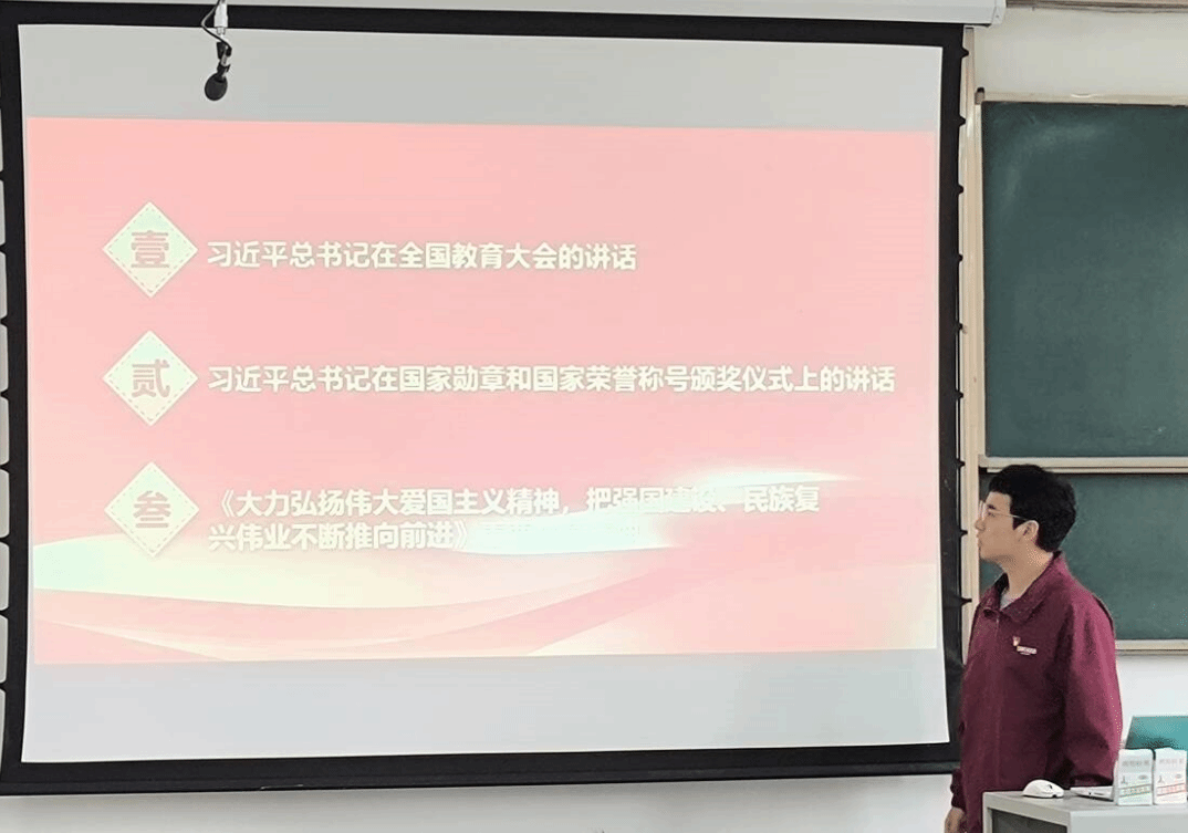 毕思琦、吴忧悠、牛玉杰、梁旭等同志领学《大力弘扬伟大爱国主义精神,把强国建设、民族复兴伟业不断推向前进》重要文章精神,号召青年大学生应当将个人发展与国家建设结合起来,弘扬爱国主义,团结向上,戮力同心,为谱写国家富强与民族复兴的新篇章贡献力量。