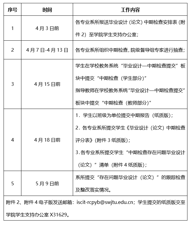 1. 全面普查,各专业系对本系所有学生进行中期检查,制定中期检查方案,进行全程质量把控。各专业系在4月3日前将答辩安排(答辩时间、答辩地点、答辩评委、答辩分组等)上报学院学生支持办公室(电子稿形式发送至邮箱[email protected],附件2)。