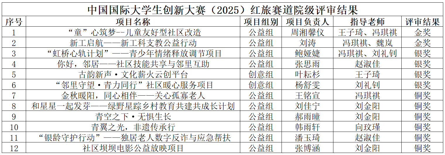 根据《关于启动中国国际大学生创新大赛(2025)“青年红色筑梦之旅”赛道院内选拔赛的通知》要求,经过自愿报名、评审委员会材料评审、院内答辩,现对院级金奖、银奖、铜奖名单予以公示,其中院级金奖将被推报参评校赛决赛。