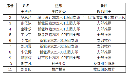 注:“十佳”团支部书记参评推荐人选从优秀共青团干部申报人选中产生,若学院所推荐候选人未评选上校级“十佳”团支部书记荣誉,将默认参评“优秀共青团干部”。