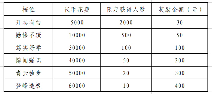 本次竞赛共设置三类奖项:竞速个人奖、排位个人奖、排位集体奖。其中竞速个人奖需要在小程序内兑换界面进行兑换,其余两个奖项在赛季结束后统一进行统计发放,奖项具体设置如下:
