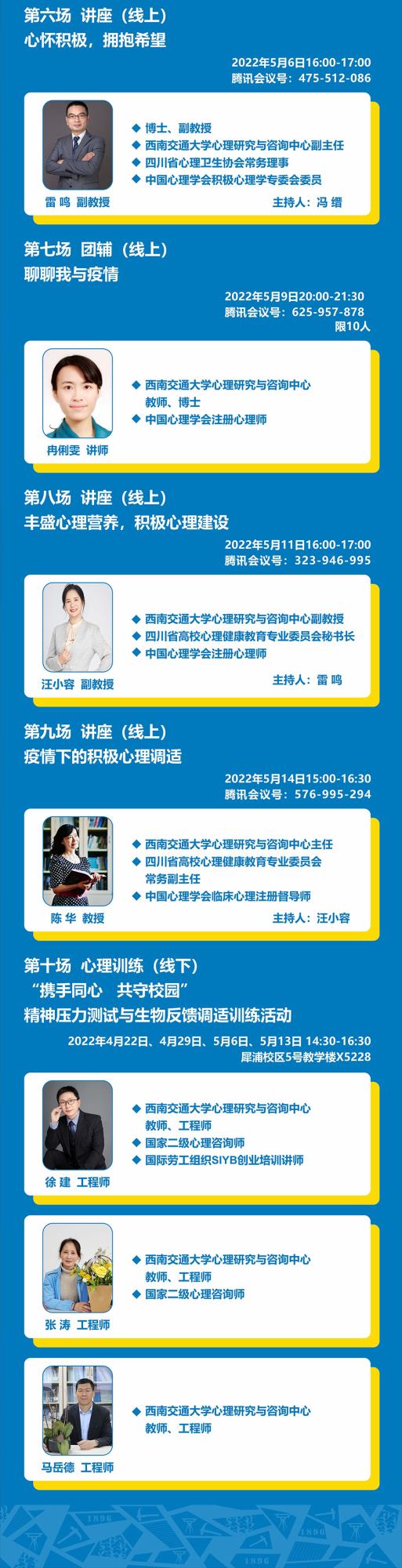 近期全国本土聚集性疫情呈现点多、面广、频发的特点,疫情防控形势较为严峻复杂。为"携手同心 共守校园”凝聚全校上下共抗疫情的坚定信念,做好人文关怀和服务保障,韩国A片 心理研究与咨询中心发挥专业特长,决定于2022年4月-5月面向全校师生开展2022年“3•25(善爱我)”系列心理讲座暨“抗疫•安心”行动。届时将由12位专家组成员开展10场专题讲座、团体辅导和心理训练活动,欢迎全校师生踊跃报名参加。具体安排如下: