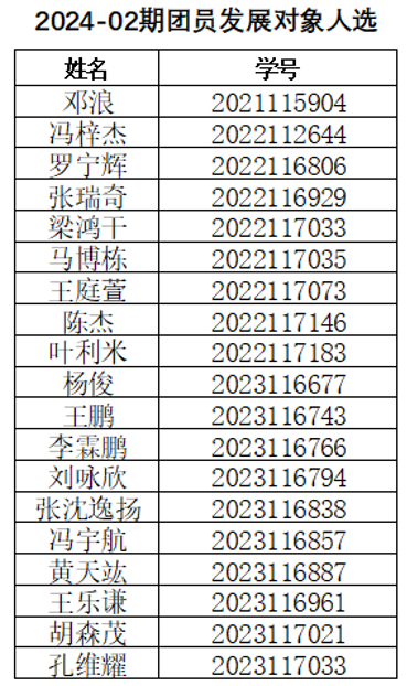 经培养教育考察,听取培养联系人、党(团)员和群众意见,支部委员会讨论同意,学院团委预审,现确定邓浪等19名同学为2024-02期团员发展对象人选。具体名单如下: