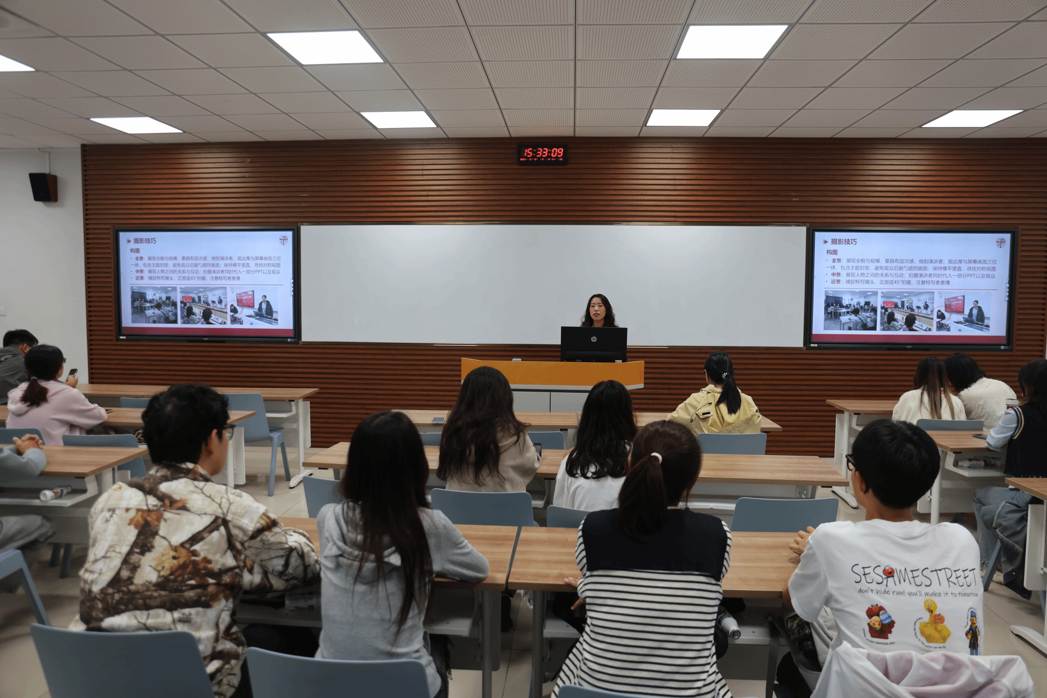 魏岚围绕活动摄影核心素养展开,从构图要领、技术基础、合影技巧三大维度深入讲解:既拆解摄影前景、中景、远景的实用方法,也针对合影场景强调“居中对齐、前低后高”的关键要点,帮助同学们建立系统的摄影认知。魏岚结合前期学生会活动摄影作品,直指“未明确拍摄核心主体”、“光线过暗导致人物黑脸”等典型问题,通过“错误案例+原因拆解+改进方案”的搭配讲解,让同学们直观理解了为何错、如何改,有效避开实操“雷区”。