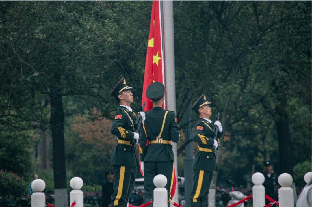 8时整,学校国旗护卫队的队员们步伐划一、眼神坚定,将国旗护送至旗台。伴随着响彻云霄的国歌歌声,鲜艳的五星红旗冉冉升起。