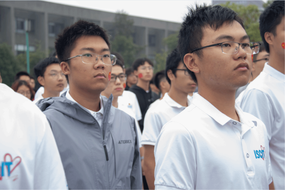 学院师生身着文化衫,党员、团员同志佩戴党员徽章、团徽,深情地唱出对祖国的清澈爱恋。在红旗的映衬下,交大校园生机盎然,智慧学子斗志昂扬。