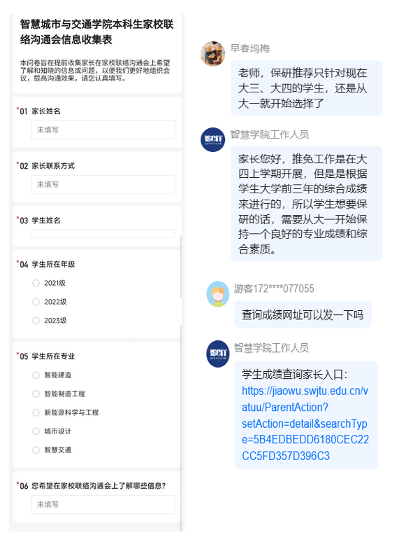 为确保此次会议高效且贴近家长关切,学生工作组提前一周向全体家长发放调查问卷,广泛征集意见与建议,问题涵盖校区建设进展、教育教学成效、学生心理健康、生涯规划指导等多个维度。在提问环节,参会人员就前期征集的问题和现场提出的问题进行一一解答。