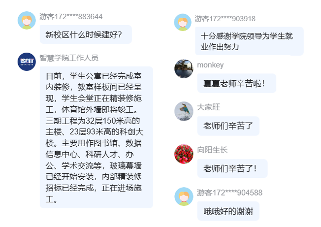 夏夏首先介绍学院正式办学地点——东部(国际)校区建设进展。目前,学生公寓已经完成室内装修,教室精装修已近尾声,学生会堂正在精装修施工,体育馆外墙即将竣工。学院已组织多批次学生党员、学生干部和学生志愿者等学生代表到东部(国际)校区参观并献言建策。在今年9月,学院将全面启动“家长开放日”、“我的校园我做主”等系列活动,定期邀请和组织家长代表和全体学生赴东部(国际)校区参观,欢迎家长朋友踊跃报名。